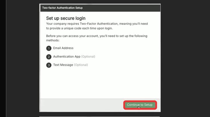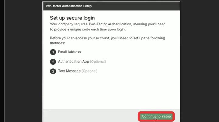 - The system will prompt the user to set up Two-Factor Authentication once the system is configured